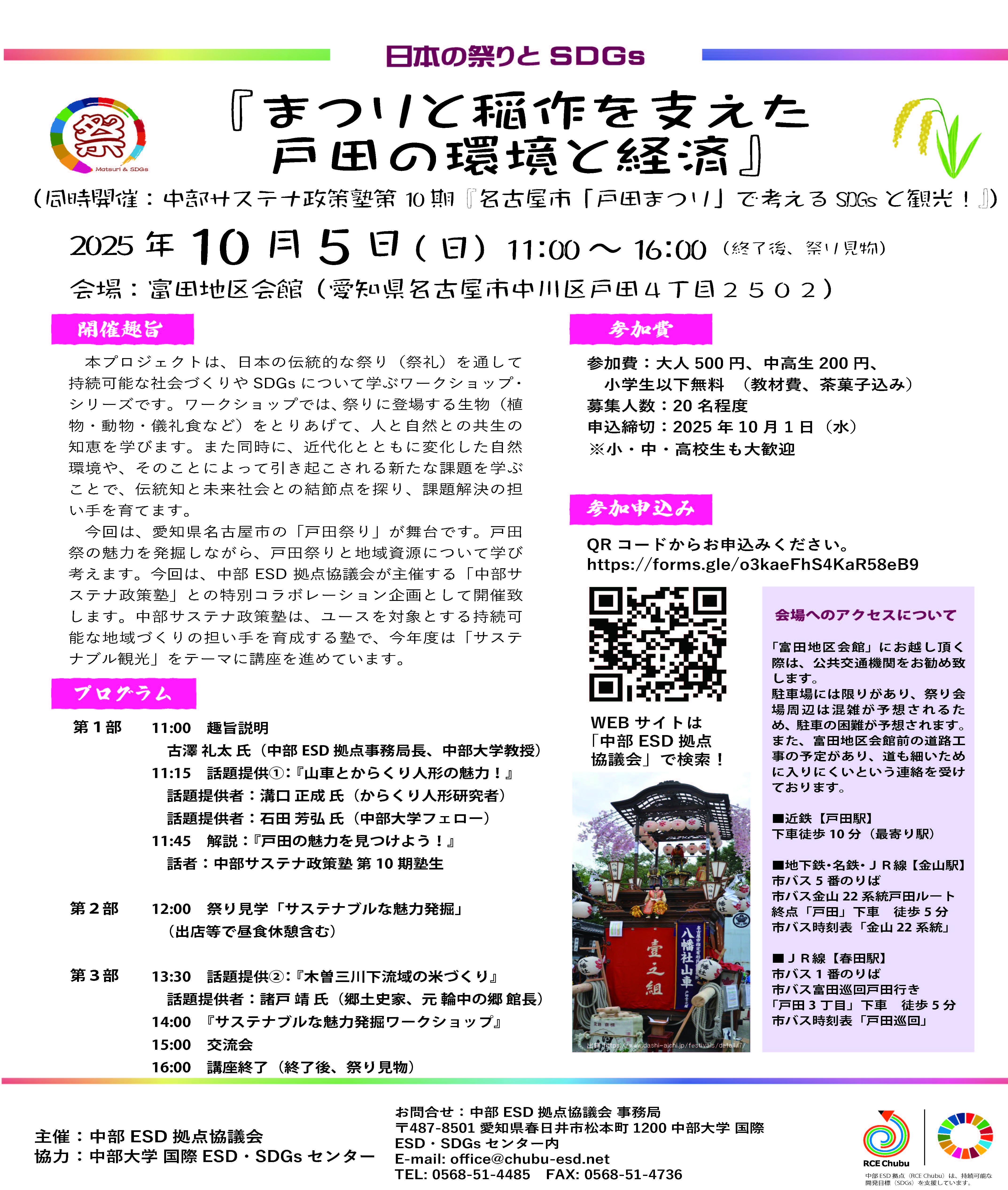 今回は、愛知県名古屋市の「戸田祭り」が舞台です。戸田祭の魅力を発掘しながら、戸田祭りと地域資源について学び考えます。また、中部ESD拠点協議会が主宰する「中部サステナ政策塾」との特別コラボレーション企画として開催致します。