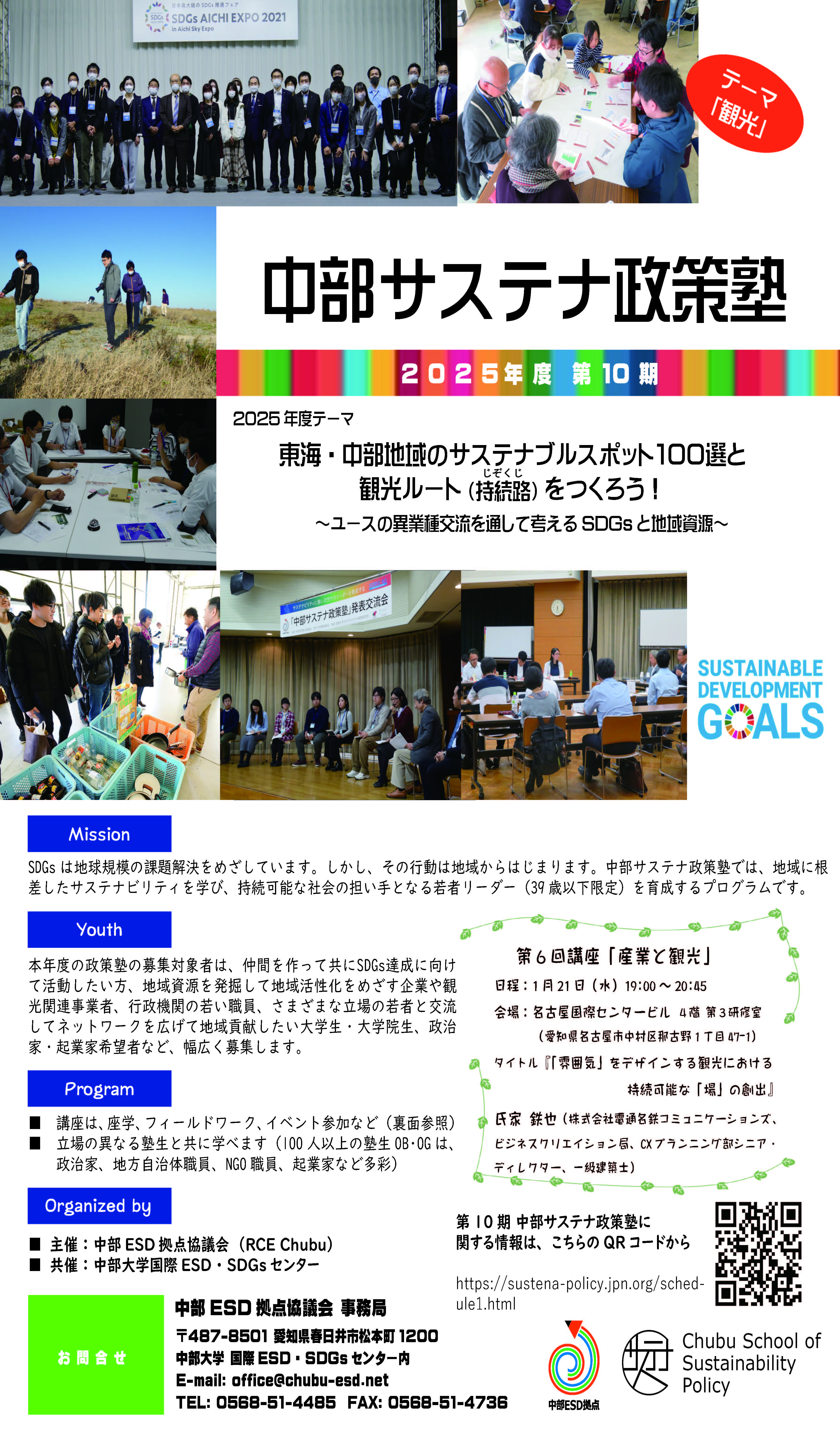 「中部サステナ政策塾」第10期のテーマは「サステナブル観光」。観光には、グリーンツーリズムをはじめとして、産業観光、文化観光などさまざまな種類があります。本年度の政策塾では、地域資源の発掘による地域活性化とサステナビリティ向上を目的として、塾生が中部圏の「観光スポット100選」を選び出し、それらを組み合わせてサステナブル観光ルート(持続路)を考案します。